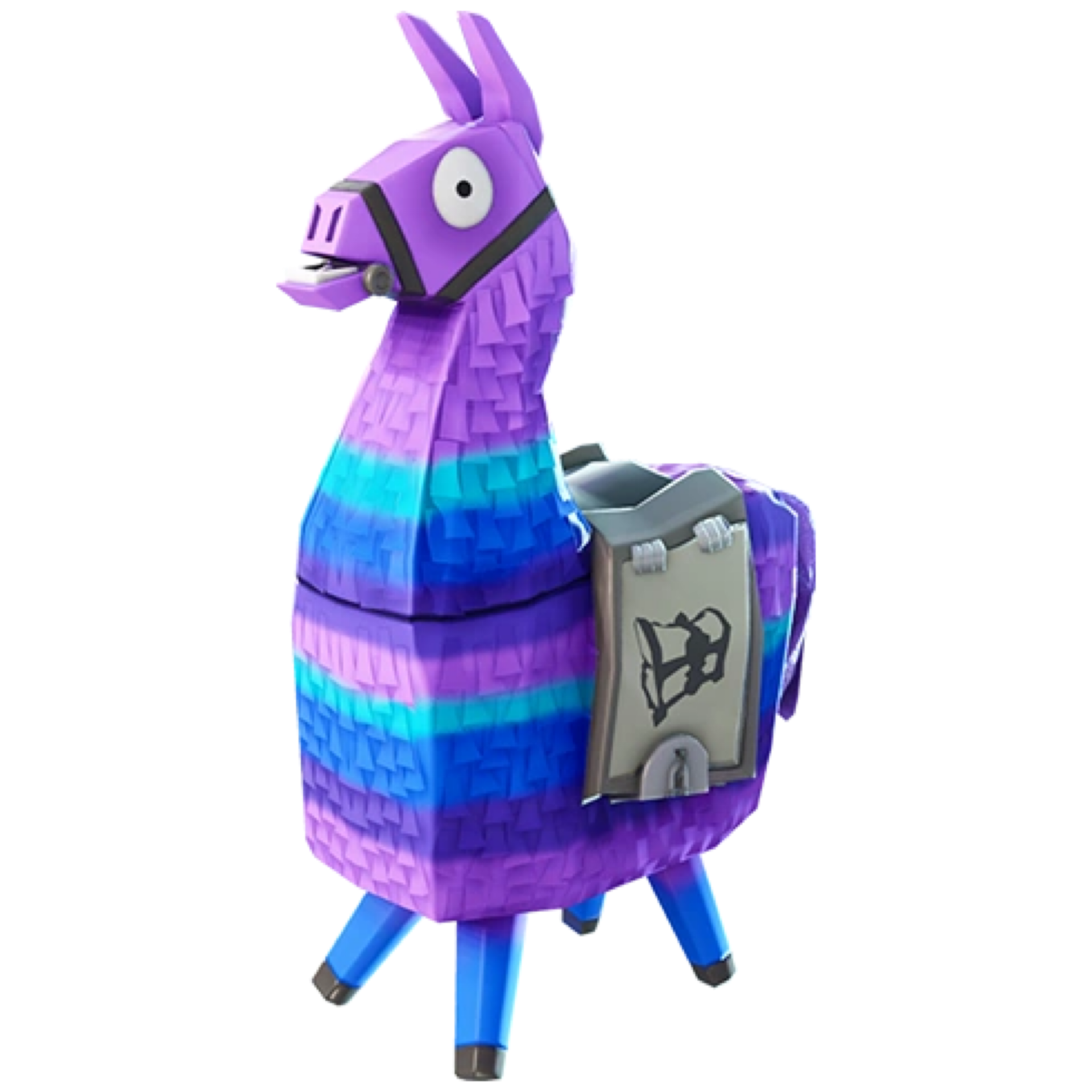 A fortnite llama-shaped piñata with purple, blue, and pink colors, carrying a small gray bag with a Disney castle logo.